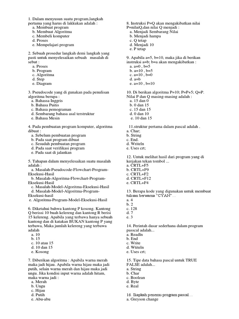 Soal Dan Jawaban Program Pascal Docx Soal Dan Jawaban Program Pascal 1 Struktur Pertama Dalam Pascal Adalah A Char B String C End D Writeln E Uses Crt Course Hero from www.coursehero.com Perintah dasar pertama saat mempelajari bahasa pascal adalah write. Digunakan untuk memanipulasi/pengaturan layar dalam pengetikan naskah yakni menampung 80 karakter dan 25 baris. Dalam sejarah bahasa pemrograman pascal menyatakan prof. Adalah sebuah operasi yang akan di periksa nilainya jika sebuah expresion menghasilkan sebuah nilai yang sesuai dengan kondisi 1 maka akan di jalankan ( statement 1 ), jika. Tipe data sederhana tipe data standard (standard data type). Struktur program yang pertama yaitu judul program. Struktur bahasa pemograman pascal paling pertama adalah. Soal dan jawaban struktur data!!!