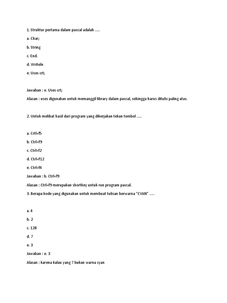 Pemrograman1 Computers Quizizz from quizizz.com Mengumpulkan informasi/mencoba kalian sudah belajar algoritma pada materi semester lalu bukan? Bagaimana struktur kode program dalam pascal? Karena keyword uses digunakan untuk memanggil unit library pascal. Struktur bahasa pemrograman pascal paling pertama adalah. Saya ingin membuat program yang jika seseorang menginput angka 1, akan tampil teks januari, yakni bulan pertama dalam 1 tahun. Tipe data pascal untuk karakter adalah. Soal dan jawaban program pascal 1. Karna dalam struktur pascal uses crt berada di bagian pertama, jadi apabila memilih yang lain programnya tidak akan jalan.